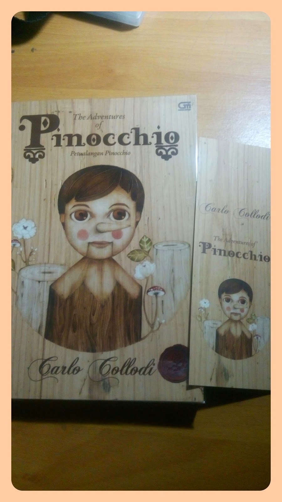 Sejujurnya ini kali pertama saya memilih buku anak-anak untuk dibaca. Biasanya saya lebih memilih membaca genre romance atau fantasi, tapi melihat buku ini sungguh saya dibuat tertarik oleh covernya yang berwarna cokelat kayu plus dengan gambar kepala Pinocchio yang belum selesai dipahat. Sebagaimana kisah Pinocchio pada umumnya, saya merasa tak banyak perbedaan dari kisah-kisah Pinocchio yang beredar kebanyakan. Kisahnya masih seputar pengukir kayu yang menginginkan seorang anak dan kemudian kayu yang diukirnya berubah menjadi boneka tali yang bisa bicara.