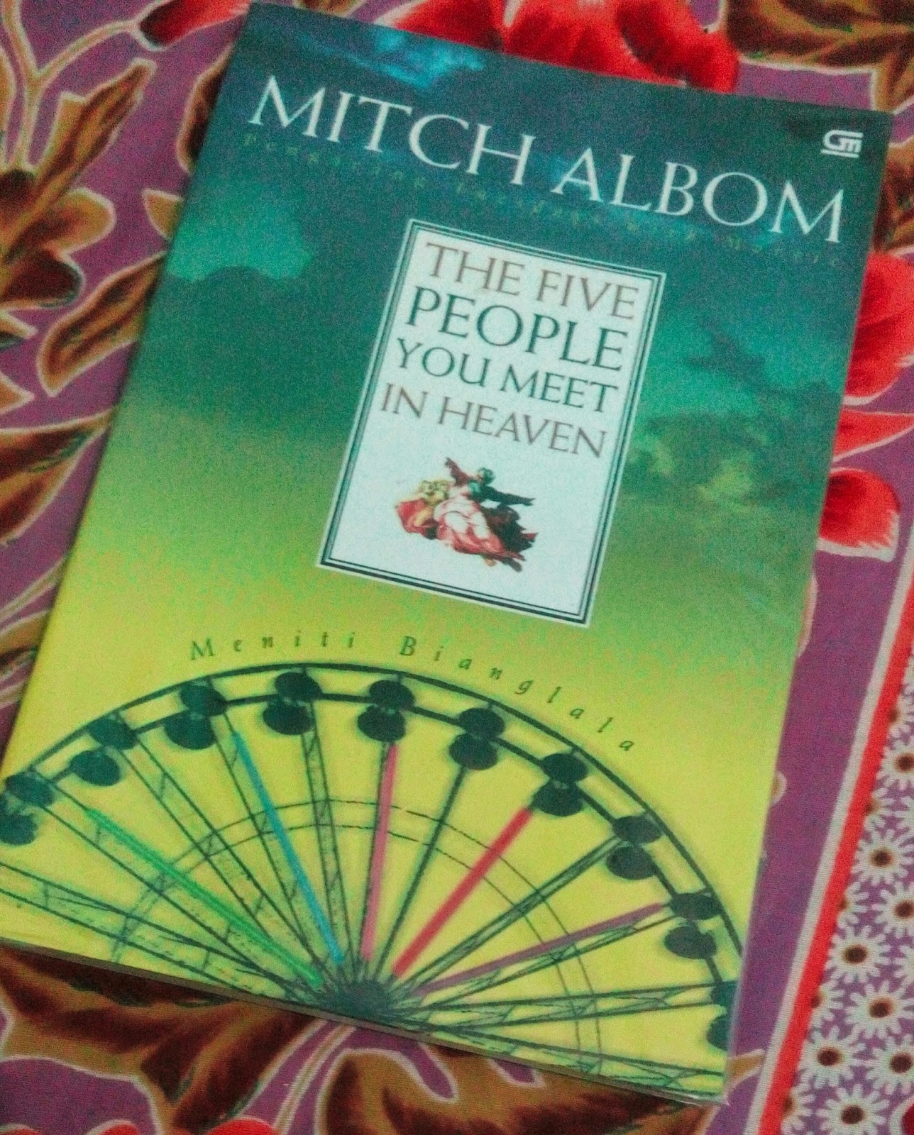 Buku ini dalam terjemahannya memiliki judul tambahan, yaitu Meniti Bianglala, yang lebih menggambarkan bahwa tokoh utama memang bekerja di sebuah taman hiburan. Pada bab awal, kita akan disuguhi oleh bab yang berjudul "Tamat". Bagaimana ceritanya ketika kisah ini dimulai, tetapi kita malah disuguhi oleh penutup? Dan ya! Ini adalah akhir. Akhir kehidupan dunia dari seseorang bernama Eddie. Tepat dengan judulnya bahwa Eddie akan bertemu dengan lima orang di dalam surga yang akan menjelaskan bagaimana kehidupannya berlangsung; sesuatu yang tidak pernah dia ketahui ketika berada di dunia.