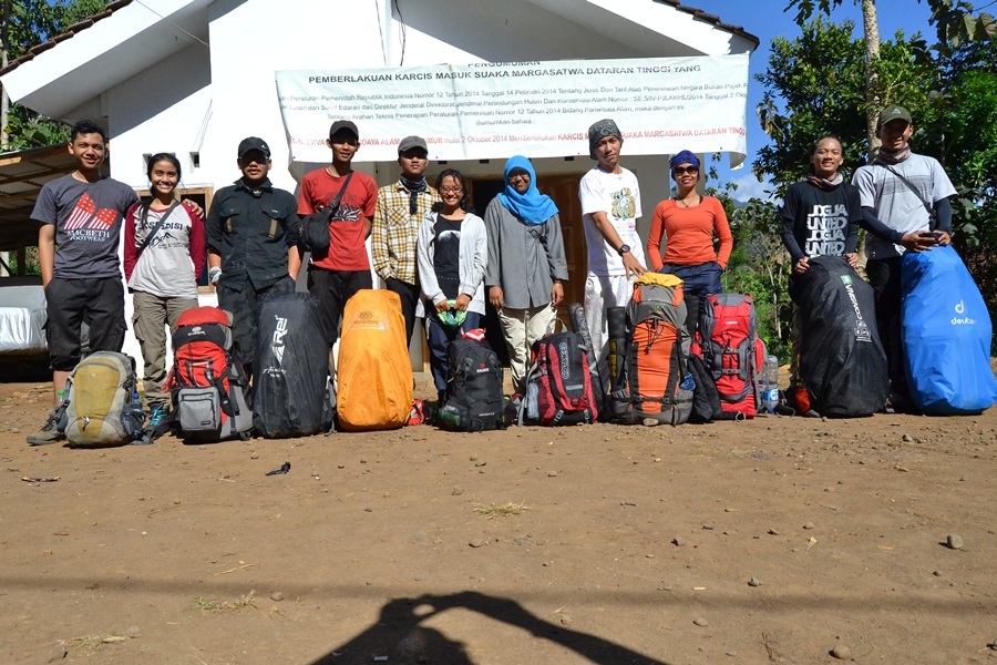 Setelah foto di depan basecamp, tepat pukul 9 pagi kami berangkat. Kali ini kami tidak hanya bersembilan, melainkan bersama dengan 2 orang tambahan dari Jakarta yang awalnya berniat mendaki hanua berdua, akhirnya mereka kami ajak bergabung saja. Aku sendiri belum kepikiran bagaimana jika mendaki gunung hanya berdua. (Kalo sama kamu sih mau hahaha).