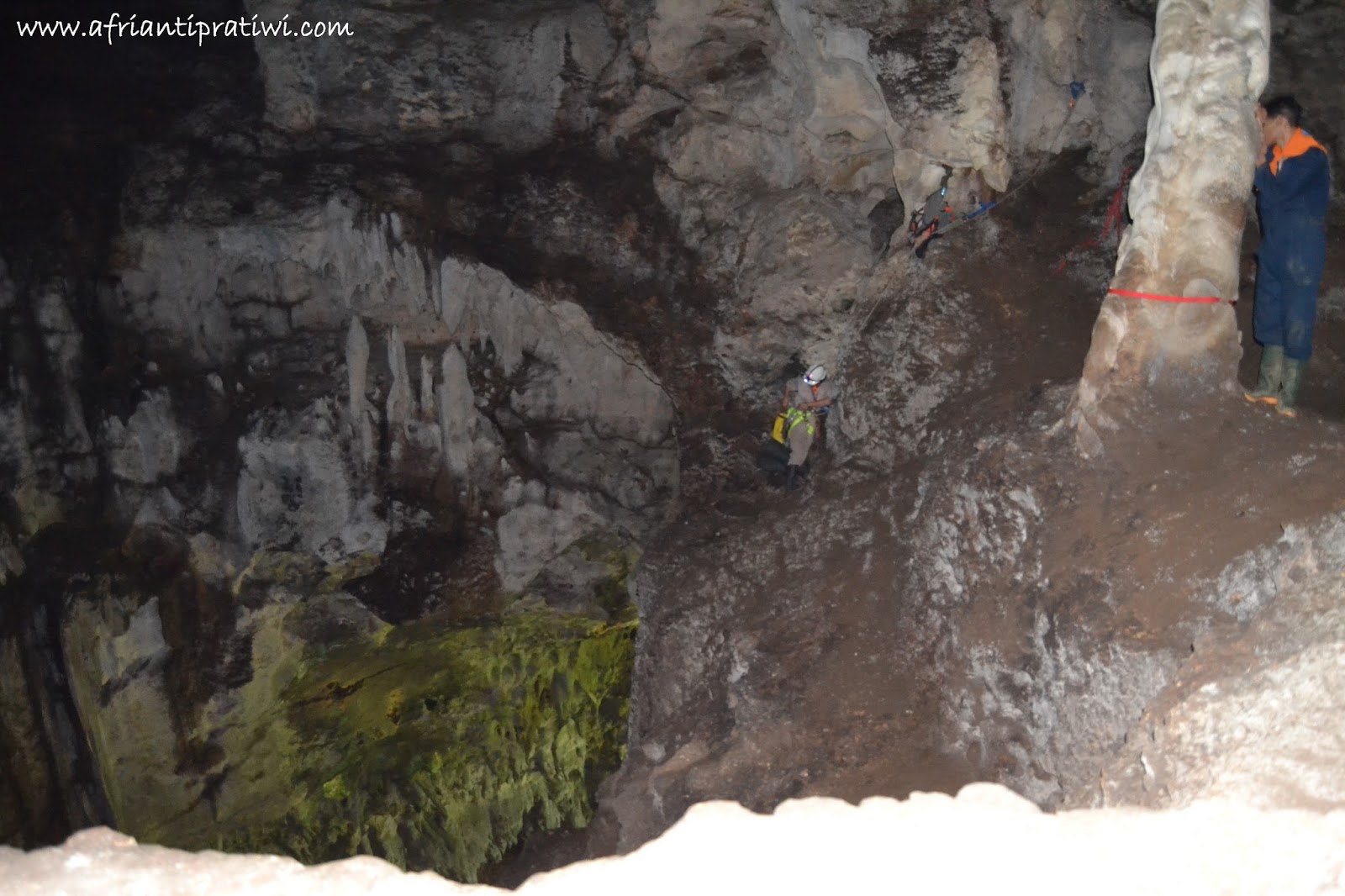 Bayangan-bayangan menyenangkan dan ketakutan berbaur jadi satu. Ketakutanku sesungguhnya sama seperti kebanyakan orang, bagaimana kalau alat yang aku gunakan tidak kuat menahan beban dan terjadi sesuatu yang tidak diinginkan? Ah, kubuang jauh-jauh pikiran itu. Kemudian aku turun ke bawah dari ketinggian 30 meter itu hanya dengan mengggunakan satu tali dan berbagai alat pengaman lainnya. Cukup lama aku turun dan mungkin paling lama karena lagi-lagi tanganku kelelahan menekan autostop (alat untuk turun dengan mengulurkan tali). Ampun deh!