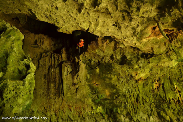 Setelah melakukan exploring dan pemetaan di Goa Kemit, esoknya kami SRT-an di Goa Petruk. Goa Petruk ini sendiri sudah menjadi tempat wisata yang biasa dikunjungi orang. Tetapi, kami bakalan naik ke "lantai dua" untuk kemudian turun ke bawah dengan SRT. Wah, gila! Ketinggiannya 30 meter, gaes! Aku sempat merinding ketika Kollin mengatakan kita harus turun ke bawah.