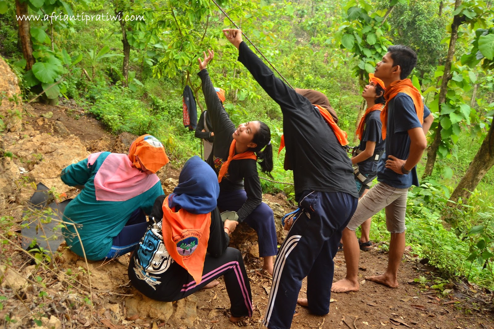 Kenapa harus panjat tebing? Ya, karena memang ini rangkaian kegiatan pendidikan lanjutan dari mapala. Hehehe. Sesungguhnya, olahraga alam bebas yang paling sulit aku lakukan adalah panjat tebing ini. Soalnya, semua bertumpu pada kekuatan kaki dan tangan. Mainan strategi juga, karena nggak bisa asal manjat. Kita harus tahu celah mana yang bisa buat pegangan dan bisa dipijak. Kalau salah pijak ya bisa saja terpleset. Contohnya nih, temen aku, si Lusi sempet jatuh pas lagi manjat. Nggak tahu ya, mungkin dia lelah. Tapi biasanya setelah itu malah pengen nyoba lagi. Hahaha