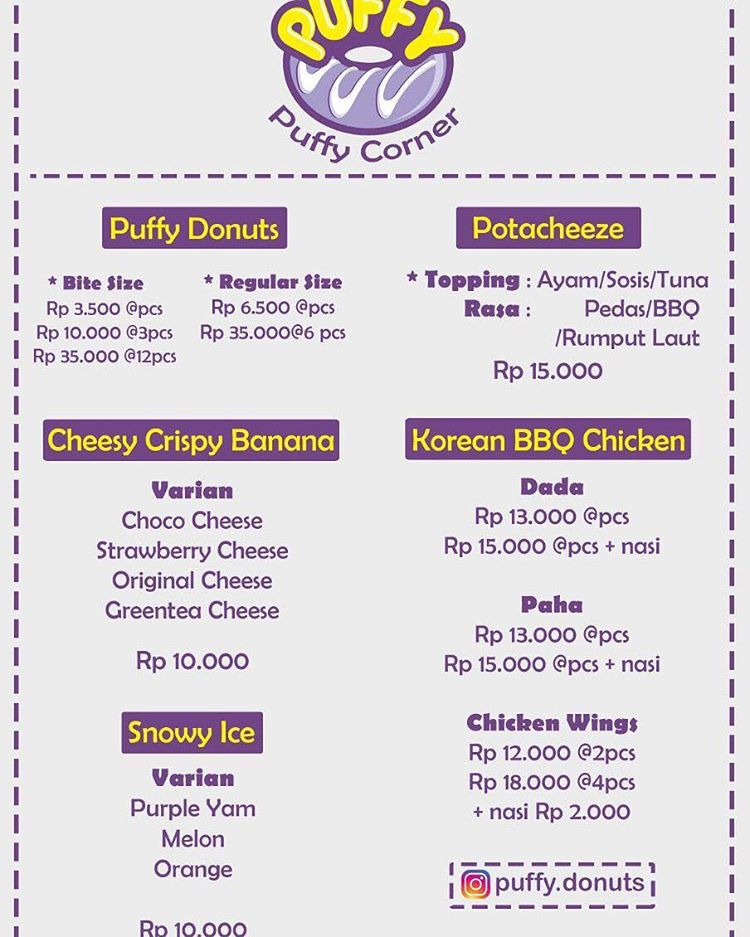 Buat kamu yang suka jajan-jajan, tapi nggak mau keluar duit banyak alias nyari jajanan murah, bisa banget mampir ke outlet Puffy Corner. Lokasinya strategis banget, dari pinggir jalan keliatan deh outletnya dengan plang warna ungu.
