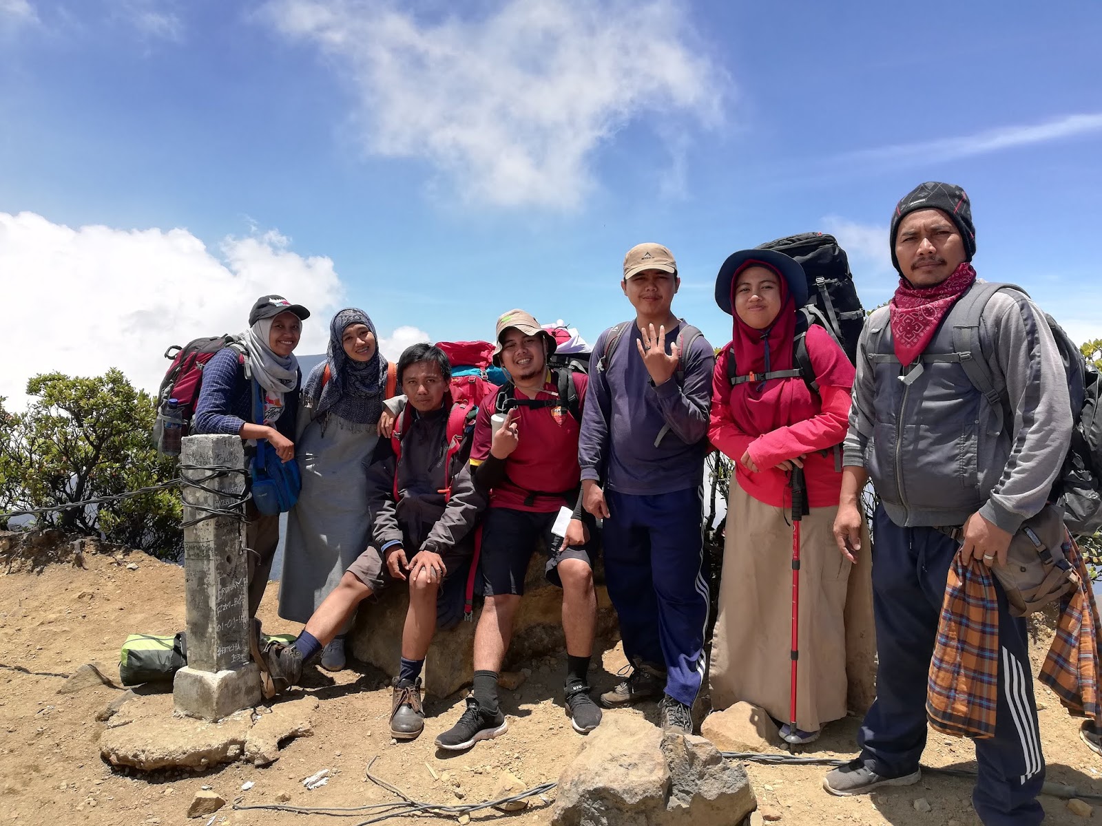 Istirahat kemudian foto-foto di tugu puncak menjadi salah satu kegiatan kami. Kak Leni pada akhirnya pun tidak tahan dengan aroma pop mie yang menggoda. Hahaha. Tepat tengah hari, kami memutuskan turun ke Kandang Badak dan akan memasak makan siang di sana.