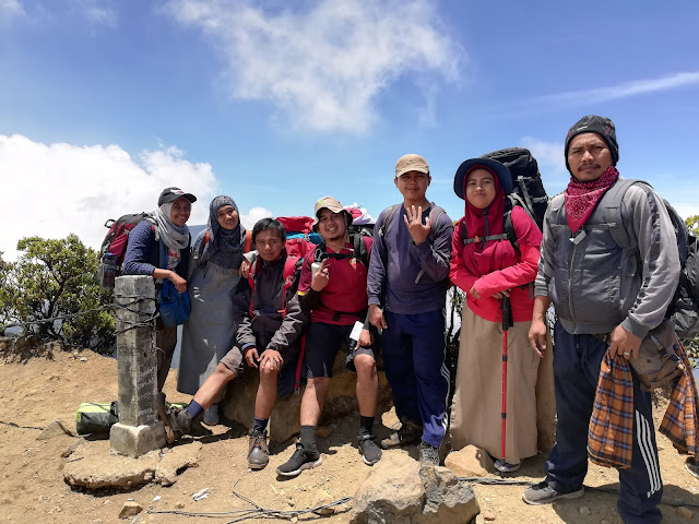 Pukul 9.45 kami baru siap berangkat menuju puncak. Memang kesiangan sih, tapi kami juga tidak berniat mencari sunrise di puncak. Melihat matahari terbit di Suryakencana sudah lebih dari cukup. Namun, banyak juga pendaki yang tidak lintas jalur baru turun dari puncak melewati tenda kami.